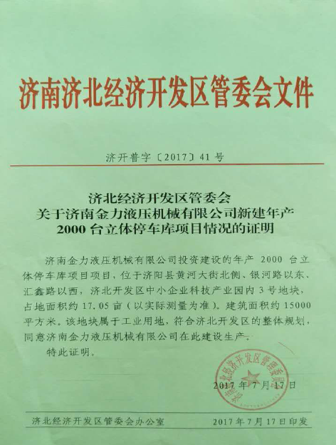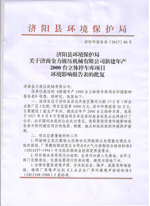 2.5《關(guān)于濟(jì)南金力液壓機(jī)械有限公司新建年產(chǎn)立體停車庫2000 臺項目環(huán)境影響報告表批復(fù)》(濟(jì)陽縣環(huán)境保護(hù)局,濟(jì)陽環(huán)報告表[2017]86號,2017年8月15日);