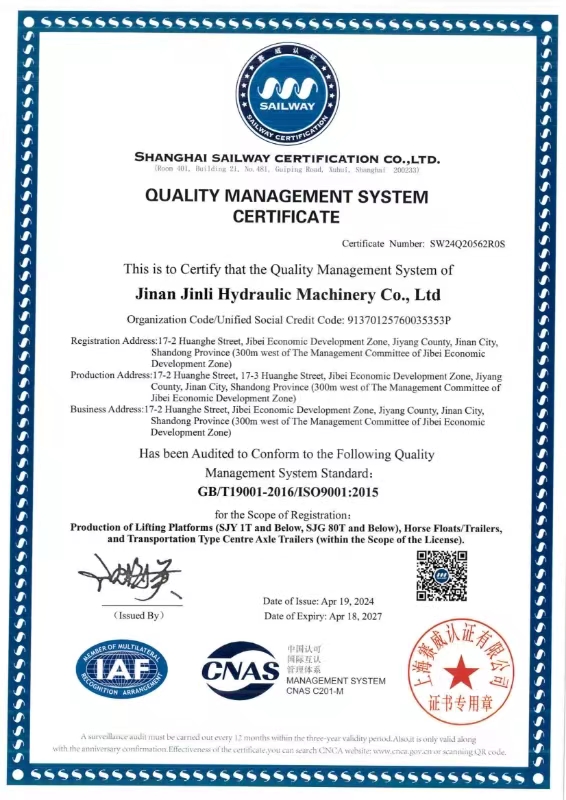熱烈祝賀金力液壓于2024年4月19日獲得9001質(zhì)量管理體系認(rèn)證證書復(fù)審